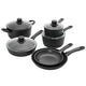 - Set includes: 8-inch fry pan, 11-inch fry pan, 2.9-quart sauté pan w/lid, 2.8-quart saucepan w/lid, 7.3-quart Dutch oven w/lid