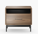 This tall storage cabinet features elegant natural wood grains, soft rounded edges, a sturdy metal base, and a proprietary interlock system with roomy self-closing drawers.