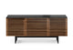 This flexible design pairs warm, architecturally inspired wood louvers with a cool, satin-tempered glass top and durable steel base.