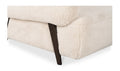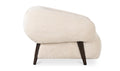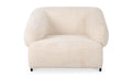 The Devlin lounge chair redefines comfort with its oversized seat and plush design, set atop solid ash legs for a modern, grounded look. Its unique silhouette is deep and inviting, blending a squared base with curved forms and off-white faux fur upholstery.