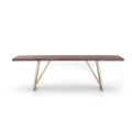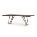 Alluring angles deliver modern elements to traditional dining style. Legs of antique bronze-finished iron lay a linear base to welcome a smooth top of light walnut.
