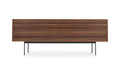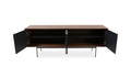 A simple design that packs a punch. Dark stained walnut veneer accompanies black corduroy wood detailing on the Araya Sideboard cupboards. This mid-century modern sideboard's large storage compartment opens to reveal four large shelves, ideal for storing your favorite board games and consoles.