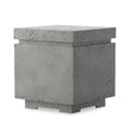 This outdoor propane tank enclosure pairs with fire tables for a clean, seamless look. Made from glass-reinforced concrete, each piece is naturally finished with deep tones of pewter and dark grey. It can act as an end table with its lid on, and has cutouts at the base for hose attachments. Cover or store indoors during inclement weather and when not in use.
