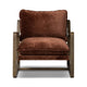 An angular frame of distressed nettlewood holds a deep seat and striking, low-slung back. Upholstered in a velvety cocoa cotton.