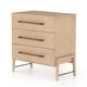 Reclaimed pine takes on a deep carbon tone, letting natural graining emit its innately rich character. Slim legs and flat, antique brass-finished iron hardware place a fresh spin on a streamlined form. Five drawers for ample bedroom storage.