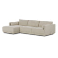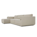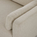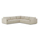 An elevated take on the modular sectional, featuring clean lines and loose back and arm cushions. A smooth linear base is fully upholstered and wraps up the arms for a shelter effect. Covered in a cream basketweave fabric that brings both texture and comfort to the entire piece.