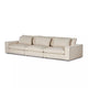 An elevated take on the modular sectional. This new collection features clean lines with loose back and arm cushions. A smooth linear base is fully upholstered and wraps up the arms for a shelter effect. Covered in a new basketweave cream fabric that brings both texture and comfort to the entire piece.