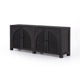 Eye-catching contrast with a textural twist. Black-washed mango frames woven cane fronts with black iron hardware. Inside, spacious shelving awaits storage of dinnerware and more. Rear cutouts for cord management.