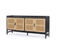 Monochromatic with a textural twist. Natural mango frames woven cane fronts, with black iron hardware for subtle contrast. Inside, spacious shelving awaits storage of dinnerware and more.