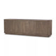 A monotone mix of textures makes this simple media console a stunner. Crafted from solid aged mango with a tall plinth base. The smooth texture of the frame brings the organic graining of the four door fronts into focus. Designed with push latch doors, removable shelves and cutouts on back for cord management.