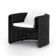 A nod to curvy Seventies styling, woven wicker framing forms a fluid, sling-like shape with a waterfall arm, with durable tufted cushioning in a versatile white. Cover or store indoors during inclement weather and when not in use.