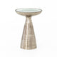 A graceful twist on geometric-inspired design. An aluminum base of raw brass forms pentagons to support a rounded top of polished white marble. An open-air look lends lightness to heavy materials.