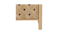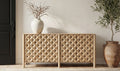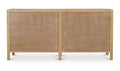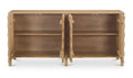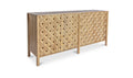 Carved from solid mango wood, the Fulton 4-door sideboard’s geometric, off-centered front creates a striking focal point. Push-to-open drawers offer effortless functionality. The natural finish showcases the wood's rich grain, celebrating its inherent beauty.