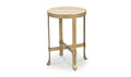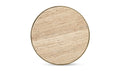 The Holli side table blends timeless travertine with sleek iron, as its organic top rests within a subtle metal rim. The antique gold base, featuring gentle curves and distinctive buckle-like detail, showcases meticulous craftsmanship in a timeless hue.