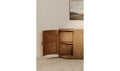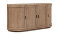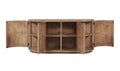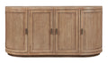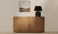 Rustic charm and contemporary design come together through reclaimed pine in the Nicola sideboard. Featuring curved doors that soften its texture, its contemporary recessed base contrasts with the rustic wood, offering a modern silhouette ideal for transitional spaces. The simple handle detail accentuates the curved design, with generous storage inside for essentials. At a comfortable 35" height, it's designed for both functionality and style, fitting seamlessly into the dining area.