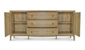 The Sadie sideboard's gentle curves and wire-brushed oak finish embrace modern traditionalism. The artfully designed overhang with rounded edges and curved front offers a soothing visual rhythm. Three middle drawers provide ample storage, while two holes for media cables allow practical organization.