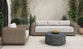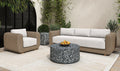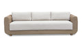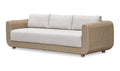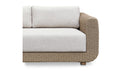 The Soma outdoor sofa finds a graceful interplay of form and purpose. Its natural finished PE synthetic wicker frame and sunproof, heathered Olefin fabric cushions exude poise and durability. Curved, playful arms and quick-dry foam invite relaxation while ensuring timeless panache.