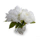 Although this traditional wedding flower only blooms in the spring, these Peony blossom reproductions will never wilt. The realistic flowers with green foliage and stems are tied together and permanently set in a clear acrylic solution that looks just like water. The cuttings are arranged by hand in a 3" cube glass vase.