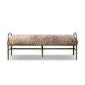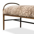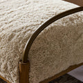 Curved brushed iron arms and an H-shaped stretcher pair with amber ash legs for a distinct material blend. Soft, cream shearling provides a tactile contrast and warm, inviting feel. A design collaboration by Amber Lewis and Four Hands.