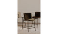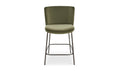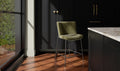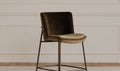 The Early counter stool is an elegant fusion of minimalist design and comfort that features a slim metal frame in a blackened bronze finish. Its seat and comfortably curved back are upholstered in durable faux mohair that resembles velvet’s soft allure but is easier to maintain. It complements any dining setting, especially alongside wooden tables, presenting a clean, cohesive look that invites sophisticated ease.