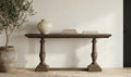 The Everson console table blends traditional elements with modern craftsmanship. Meticulously molded detailing and graceful leg profiles with a stretcher in between showcase its sophisticated design. Crafted from sustainable mango wood, the rich brown finish enhances the natural grain.