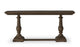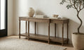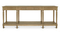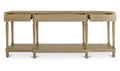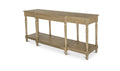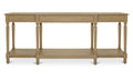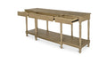 Meticulously crafted from solid oak with a rich brown finish, the Martha console table's graceful silhouette features an alluring overhang and expertly turned legs. A subtly protruding middle drawer adds dimensional intrigue, while three drawers and an open shelf offer discreet storage.