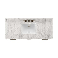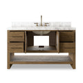 Set the tone for a calming, peaceful space with this simple, yet spacious design. Crafted with a wire-brushed, thick oak veneer base in a natural finish for added character, a Carrera marble top and solid brass hardware. A mix of drawers, cabinets and open shelving offers a variety of storage and styling options. Finished with a bath-safe sealant for moisture resistance. Designed to accommodate 8”-widespread faucets and standard-size hardware for easy customization; faucet shown not included. Sink and backsplash included; backsplash ships separately. Removable back with cutouts for plumbing; fits standard P-trap.
