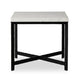 An open, hand-hammered brass base supports a squared top of white marble, for a beautifully streamlined end table with rustic vibes.