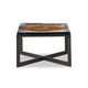 An airy, angular base of charcoal-burnished iron supports a squared tabletop of amber cast glass. Styles well alone or paired in multiples.