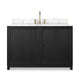 A sleek design built with tons of storage. Crafted with a thick oak veneer base in a satin black finish, a Carrera marble top and iron hardware in an antique bronze finish. A mix of drawers and cabinets offers plenty of storage. Drawers are fully finished in light natural oak; top drawer is not functional. Cabinets include removable shelves. Finished with a bath-safe sealant for moisture resistance. Designed to accommodate 8”-widespread faucets and standard-size hardware for easy customization; faucet shown not included. Sink and backsplash included; backsplash ships separately. Removable back with cutouts for plumbing; fits standard P-trap. Professional installation required.