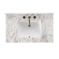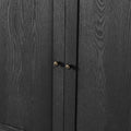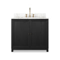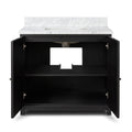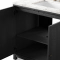 A sleek design built with tons of storage. Crafted with a thick oak veneer base in a satin black finish, a Carrera marble top and iron hardware in an antique bronze finish. Spacious cabinets include removable shelves. Finished with a bath-safe sealant for moisture resistance. Designed to accommodate 8”-widespread faucets and standard-size hardware for easy customization; faucet shown not included. Sink and backsplash included; backsplash ships separately. Removable back with cutouts for plumbing; fits standard P-trap. Professional installation required.