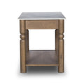 Antique turn shape-inspired with a fresh geometric twist. Finished in toasted oak and paired with white marble, it offers functionality with three drawers on each side, plus a spacious bottom shelf for bonus storage.