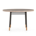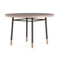 Mixed materials make the table. A rounded tabletop of taupe-finished concrete tops slim, teak-capped aluminum legs, which slightly splay for extra intrigue. Seats four comfortably. Cover or store indoors during inclement weather and when not in use.
