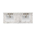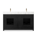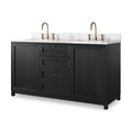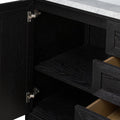 A sleek design built with tons of storage. Crafted with a thick oak veneer base in a satin black finish, a Carrera marble top and iron hardware in an antique bronze finish. A mix of drawers and cabinets offers plenty of storage. Drawers are fully finished in light natural oak; top drawer is not functional. Cabinets include removable shelves. Finished with a bath-safe sealant for moisture resistance. Designed to accommodate 8”-widespread faucets and standard-size hardware for easy customization; faucet shown not included. Sink and backsplash included; backsplash ships separately. Removable back with cutouts for plumbing; fits standard P-trap. Professional installation required.
