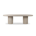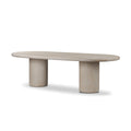 A simple double pedestal silhouette designed to let the material shine. This outdoor dining table features textured sand concrete meant to resemble the variance of natural stone, with a marbled look that's unique to each piece. Cover or store indoors during inclement weather and when not in use.